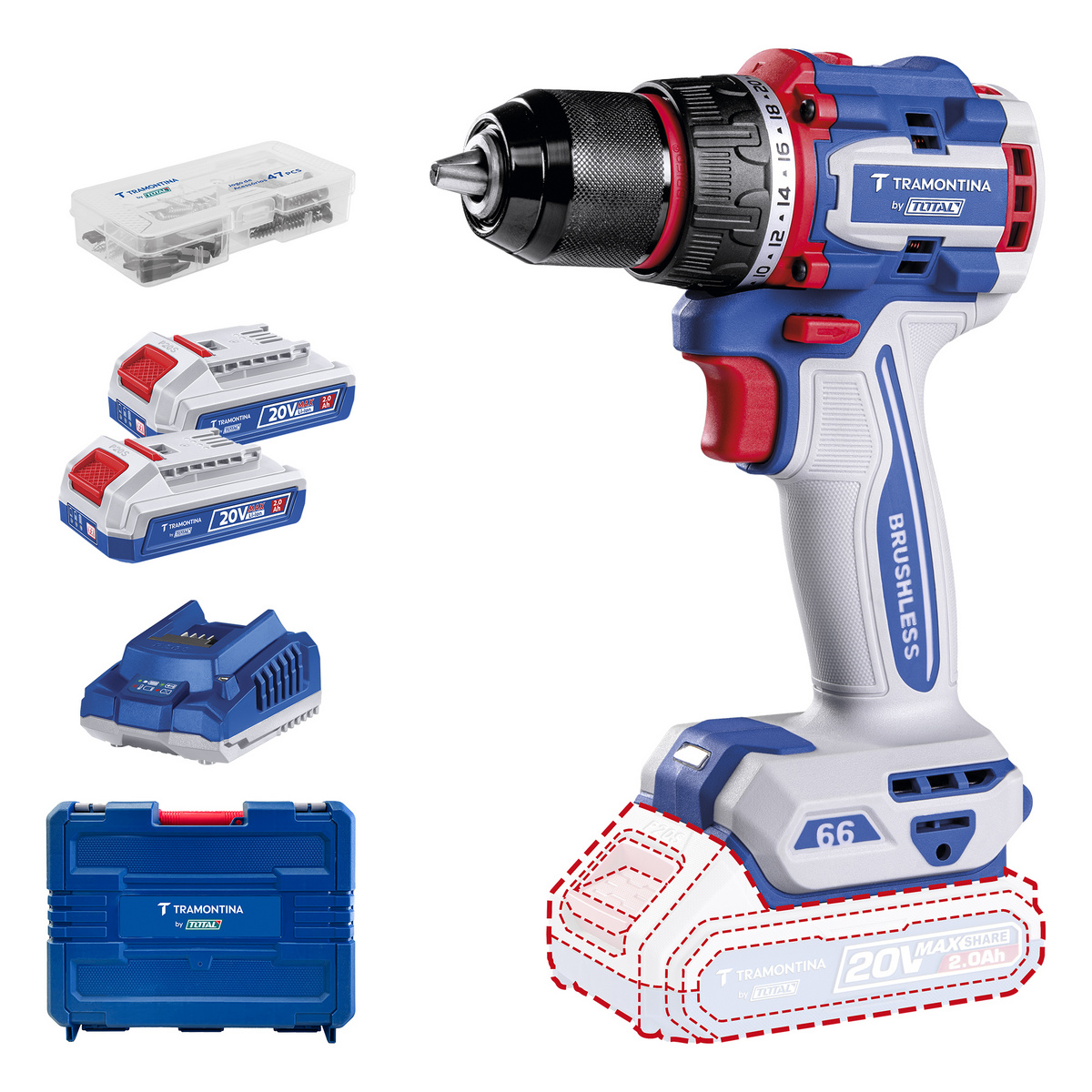 Motor brushless (sem escovas). Tensão: 20V Rotação máxima: 0-500/0-2000 rpm Torque máximo: 66 N.m Mandril metálico. Capacidade do mandril: 1/2" (13 mm). Configurações de torque: 22+1 2 Velocidades mecânicas. Sistema de bloqueio do eixo. Luz de trabalho LED integrada. Acompanha: 47 acessórios 2 baterias 20V 2,0 Ah 1 carregador bivolt Maleta